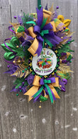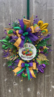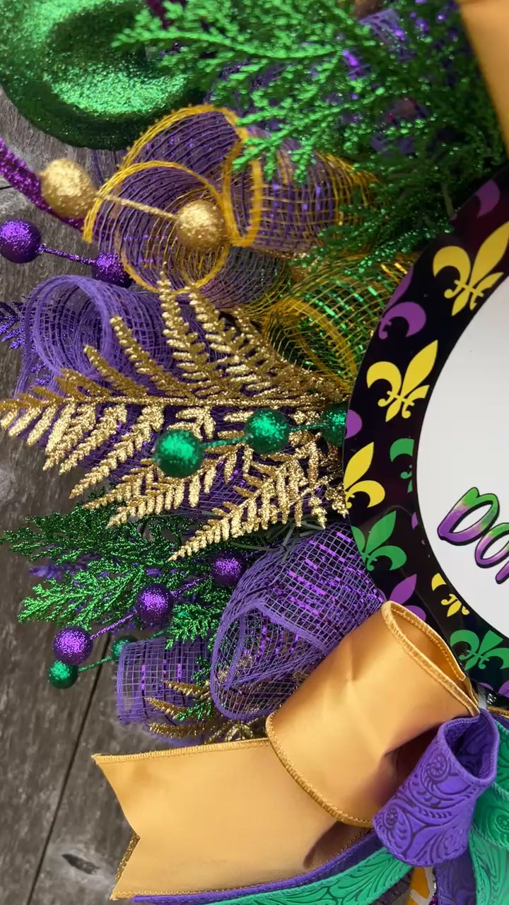This Mardi Gras Wreath is the perfect decoration for the festive season. Made with traditional colors and designs, this wreath adds a touch of celebration to any space. Get ready to celebrate in style with this beautifully crafted wreath!
