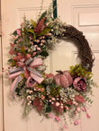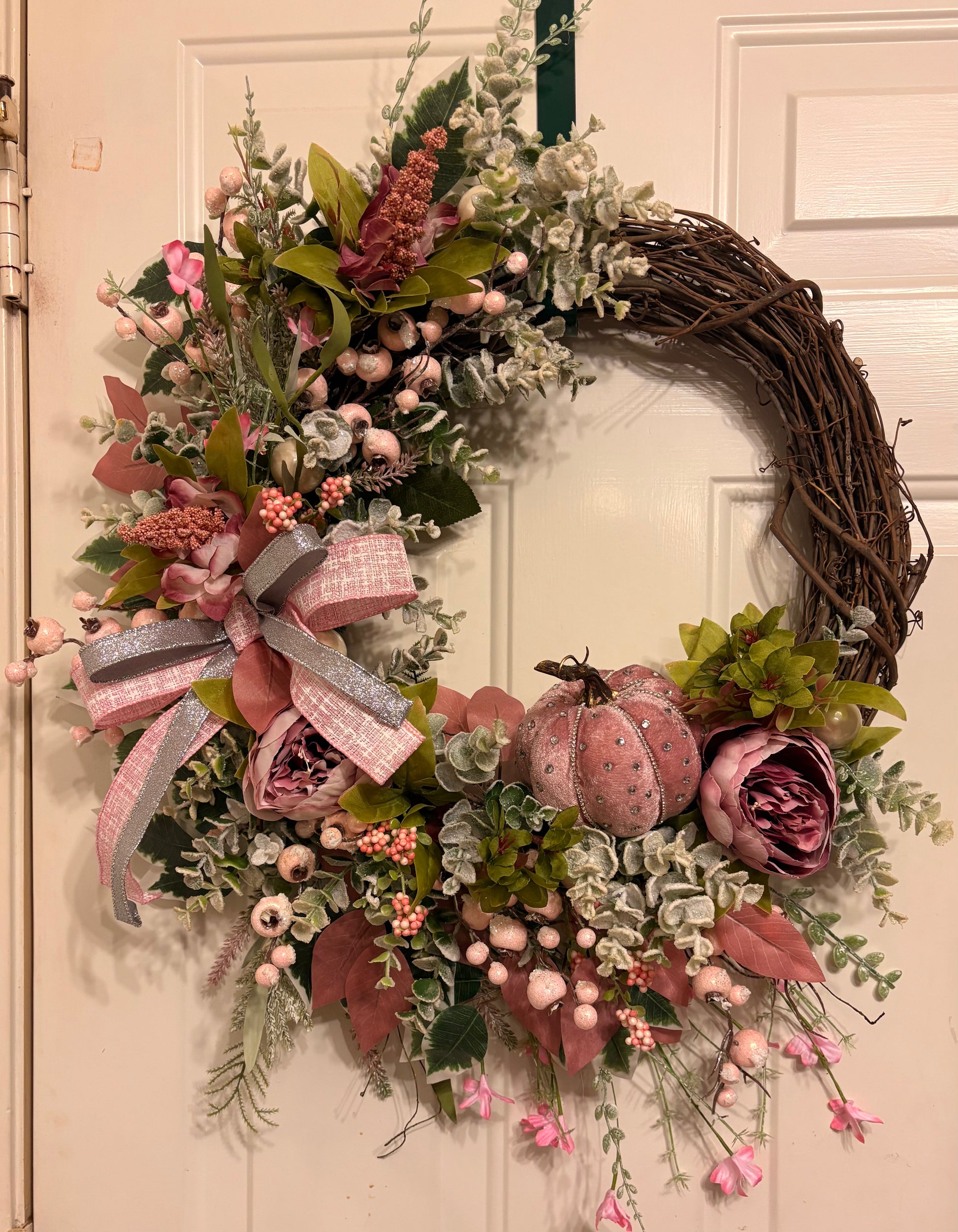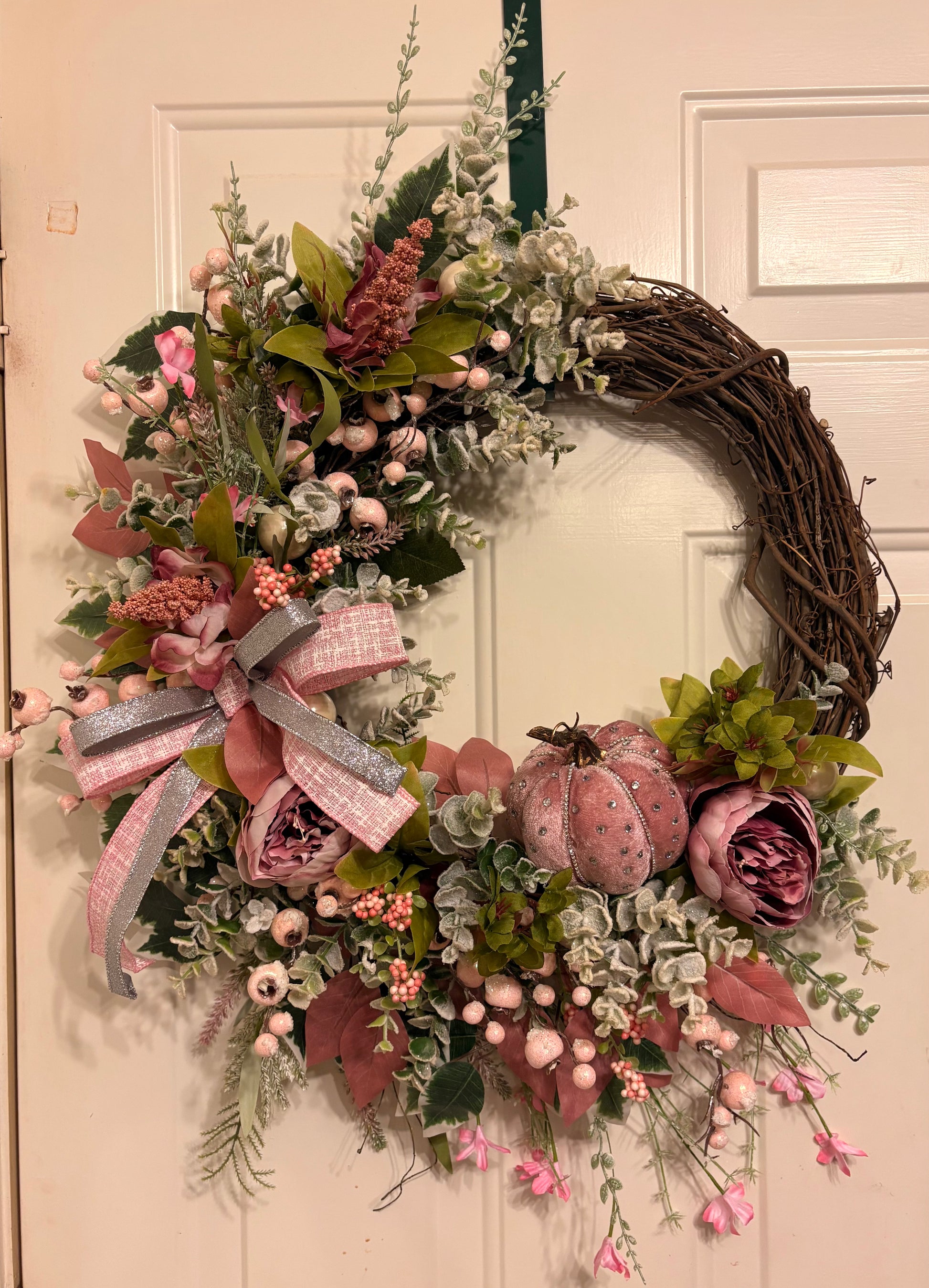 This Pink and Silver Glam wreath is perfect for adding a touch of elegance to your fall decor. Featuring a combination of delicate pink flowers and shimmering silver accents, this wreath is sure to make a stylish statement in any room. Made with high-quality materials, it will last for seasons to come.