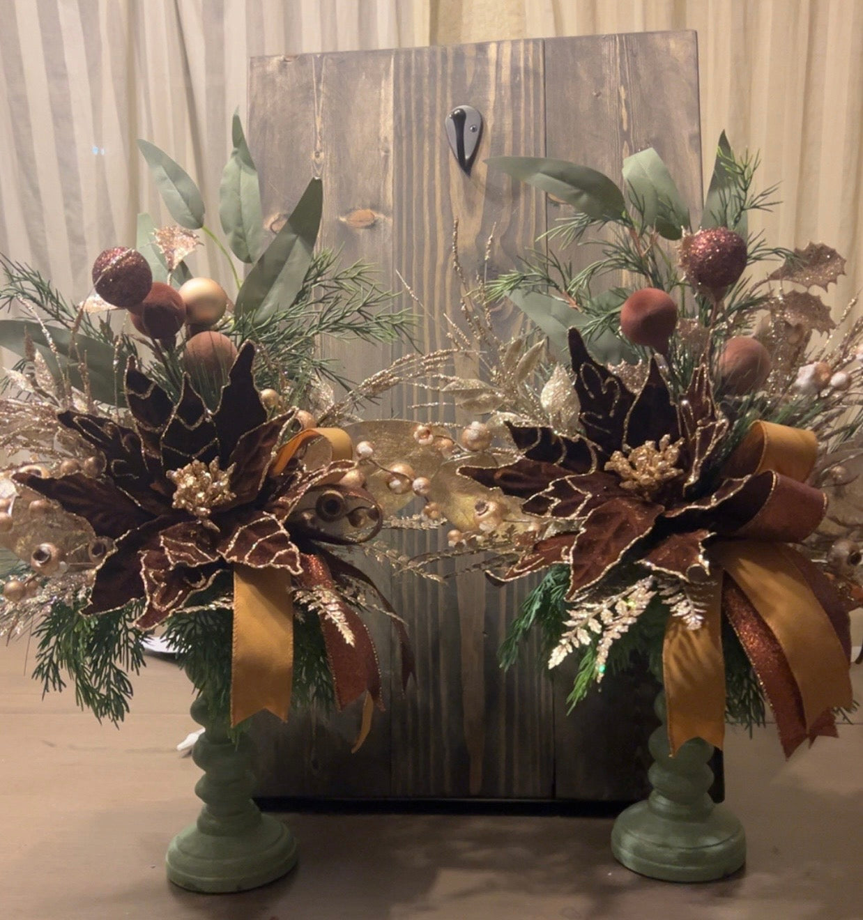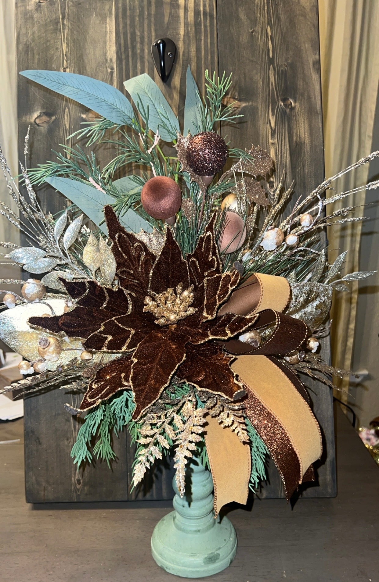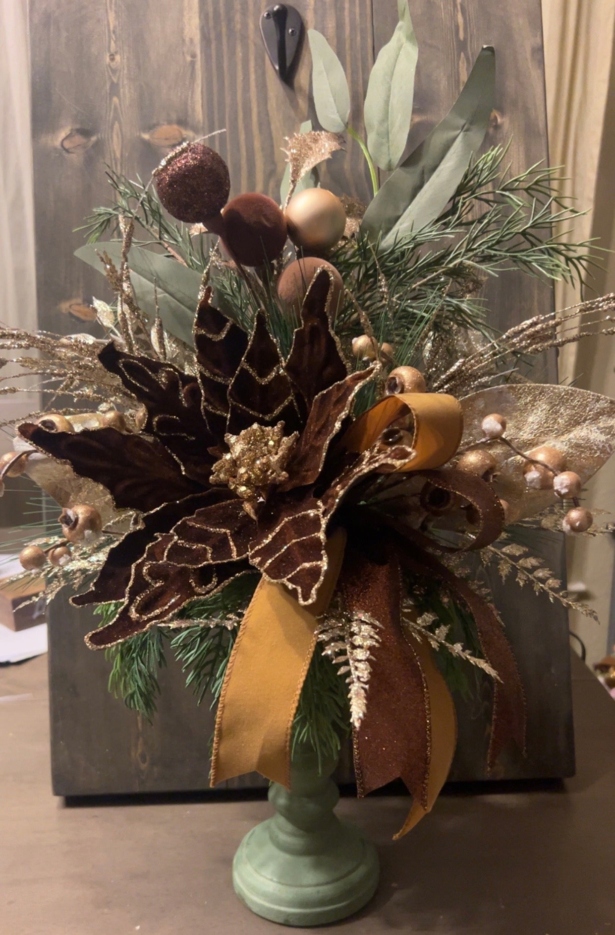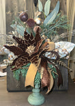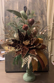 Enhance your holiday decor with our elegant Poinsettia centerpiece. This centerpiece features beautiful brown, champagne gold, and sage colors that will add a touch of sophistication to any room. Perfect for a festive table setting or as a stunning focal point in your home.